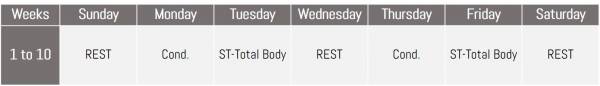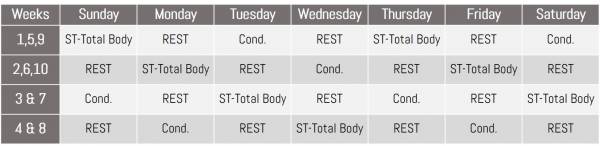I recommend a maximum training segment duration of 8-10 weeks. Below are some example 10-week out-of-season training plans, broken down in terms of stress exposures and recovery time. I’ve laid out two traditional and three non-traditional plans for five days per week, and one non-traditional approach for seven days per week. Strength training (ST) is any weight room work. Conditioning (Cond.) would include any interval running, agility drills, or speed work.
